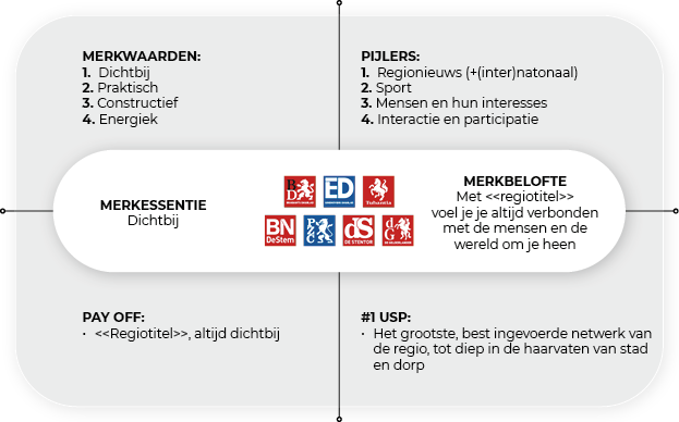 We staan dichtbij de lezer (geografisch en emotioneel, betrokken bij, verbonden met en trots op inwoners en regio, met aandacht voor (h)erkenning in verhalen, mensen en locaties). We houden het graag praktisch (begrijpelijk, toepasbaar en duidelijk wat het voor jou betekent, gidsend), constructief (oplossingsgericht, opbouwend, met perspectief, glas halfvol, helpend) en energiek (pro-actief, we hebben er zin in, stimulerend, competitief, doortastend, vasthoudend).
