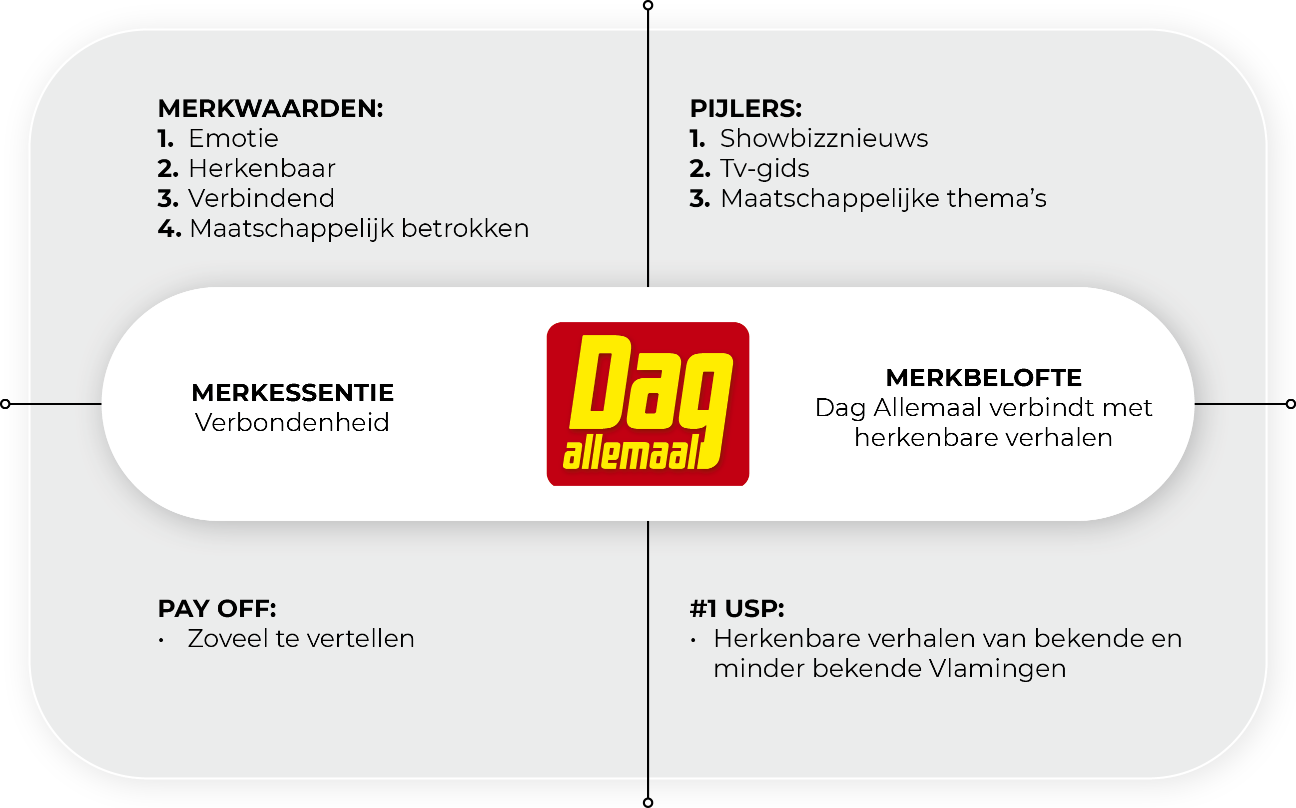 Kortom, Dag Allemaal is het grootste weekblad van Vlaanderen met onderwerpen die u raken. Het blad verrast, onthult, ontroert en informeert. Daarom beloven we: Dag Allemaal verbindt met herkenbare verhalen.