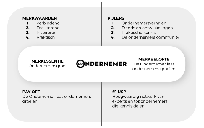Onze merkwaarden bepalen hoe wij ons werk doen en hoe we ons onderscheiden. We zijn verbindend (we brengen ondernemers samen, laten ondernemers zelf aan het woord, staan naast hen en we zijn betrokken) en faciliterend (we brengen het meesterschap van ondernemers en experts in stelling en maken het toegankelijk), We willen inspireren (we erkennen en vieren het mooie van ondernemen, en motiveren met herkenbare verhalen) en we zorgen ervoor dat wat we bieden ook praktisch toepasbaar is (we bieden tools, inzichten en adviezen die ondernemers meteen kunnen gebruiken).