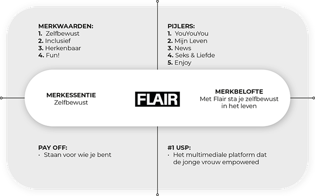 Flair is dé plek voor de jonge vrouw (25 -45 jaar), midden in een levensfase waar allerlei life changing events plaatsvinden. Een eerste baan, een partner, eerste huis, een baby. Een echte digital native die continu klikt, swiped, liked en shared. Tijd te kort komt, snackable (online) content wenst, maar ook ontspanning en me-time. Die mee wil praten: van juice tot maatschappelijke topics en de laatste trends. De vrouw die bezig is met de wereld om zich heen, maar vooral belachelijk druk is met zichzelf;-)