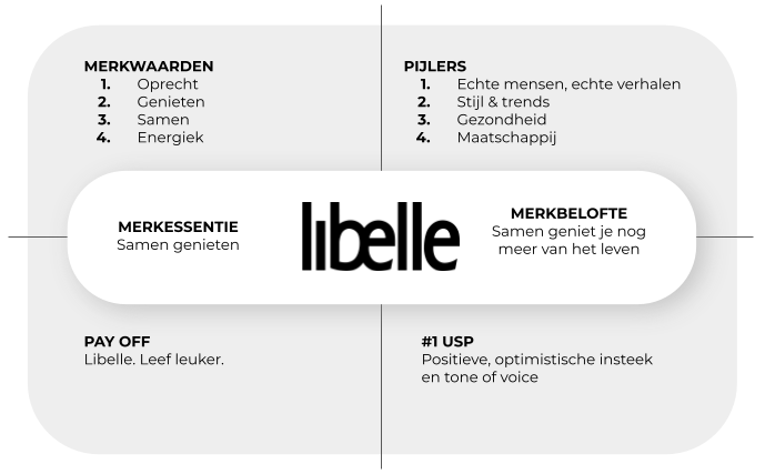 Zo versterkt Libelle haar positie als het # 1 multimediale vrouwenmerk (print en online) onmisbare voor de vrouw van 45 – 60 jaar die actief in het leven staat en elke dag het leven een stukje leuker, mooier en waardevoller wil maken. Libelle is een bron van inspiratie, informatie en ontspanning die je helpt alles uit het leven te halen en weet dat dit alleen kan met de mensen en de wereld om je heen.
