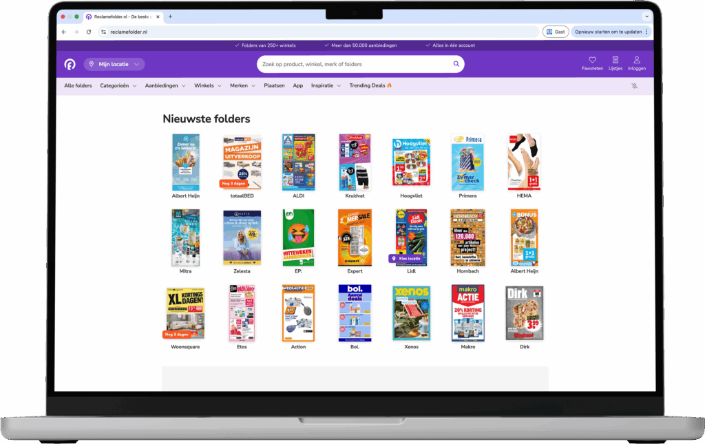 Daarom bieden we elke dag een volledig overzicht van folders en aanbiedingen (up to date en overzichtelijk, met focus op de dagelijkse boodschappen). Met onze handige navigatie vind je snel en eenvoudig de weg naar de juiste producten. We brengen inspirerende content (recepten, tips en relevante informatie die besparen leuk en makkelijk maken) en zorgen met onze slimme tools voor meer gemak en efficiëntie (persoonlijke aanbiedingen en handige functies zoals favorieten en boodschappenlijstjes).